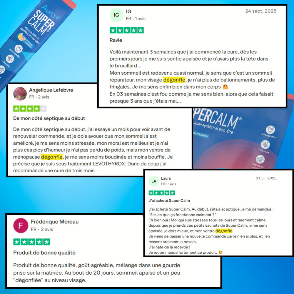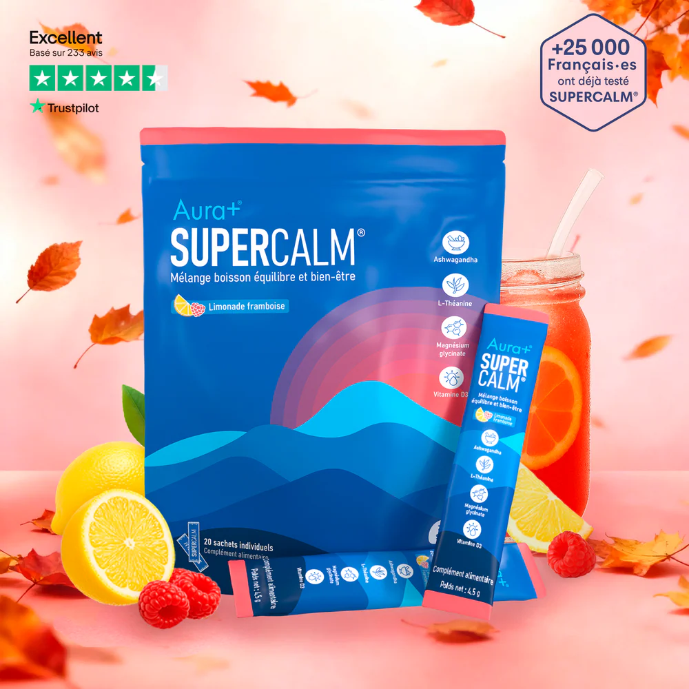 IMPORTANT : Le SuperCalm authentique n’est vendu que par Aura+. Nous ne pouvons garantir la qualité ni la sécurité des compléments au packaging similaire achetés ailleurs. Pour être certain d’obtenir un produit conforme et sûr, commandez uniquement ici, sur notre site officiel.